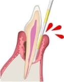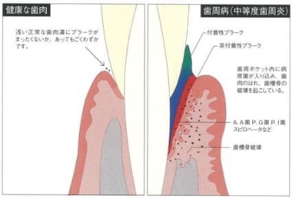 これらの菌が、歯肉溝(歯と歯ぐきの境目)の中で異常増殖すると歯周ポケットさ形成され、付着部が歯面からはがれ、続いて歯肉が腫れ、歯槽骨の破壊を起こさせます。