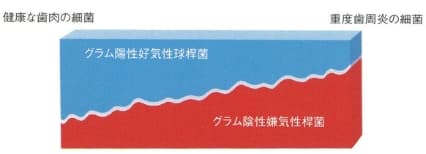 健康な歯肉溝では、バイオフィルムの75%が常在菌(グラム陽性好気性球桿菌)であり、歯周病の病原性はありません。成型歯周炎の歯周ポケットでは、グラム陽性嫌気性桿菌が75%を占め、健康な歯肉溝と歯周病の歯周ポケットのバイオフィルムには大きな違いがあります。歯周病に罹患した歯周組織を健康な組織にするためには、この嫌気性菌、グラム陰性菌、スピロヘータの数を減らさなければなりません。